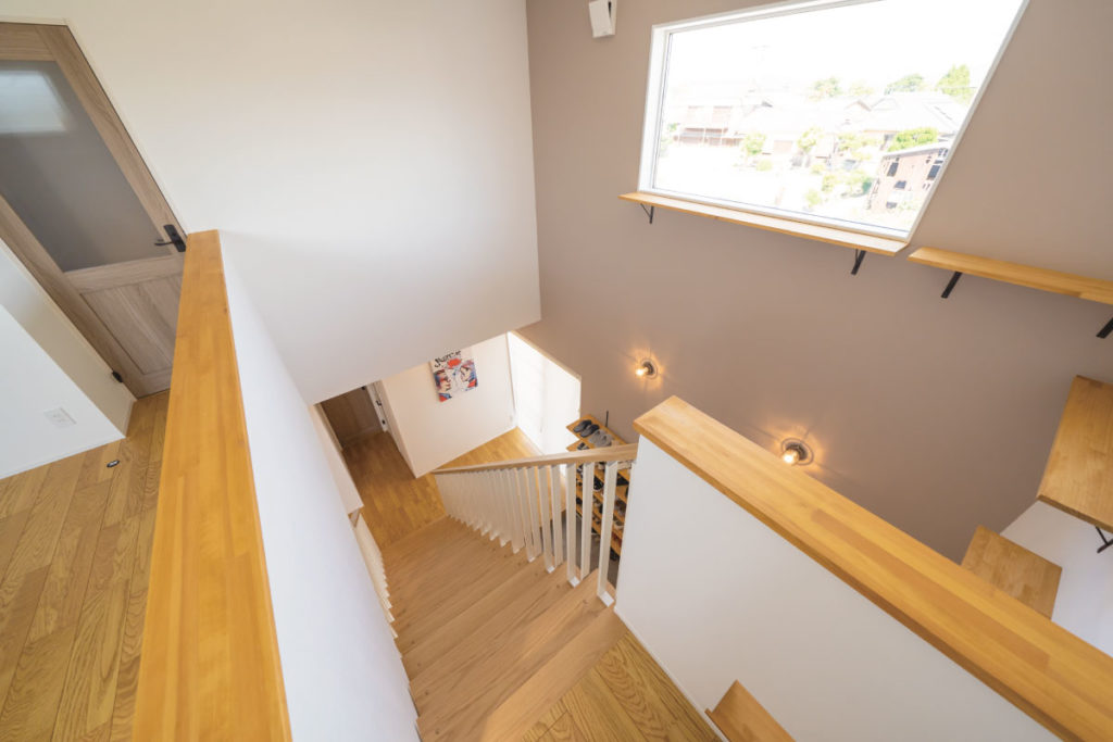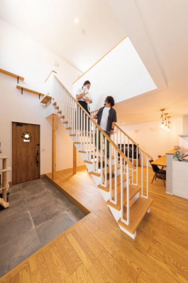 吹き抜けからの光が穏やかに注ぎ、アクセントにもなっているキャットウォークでは 愛猫の「しらたま」がくつろいでいます。