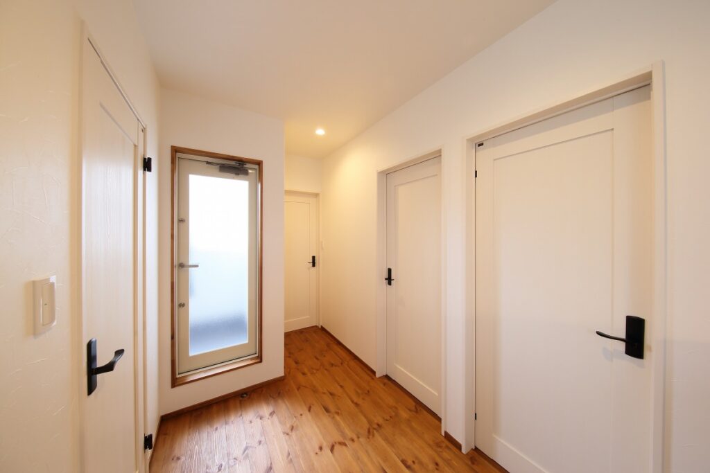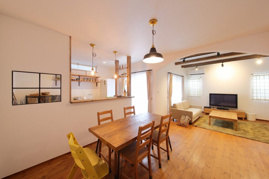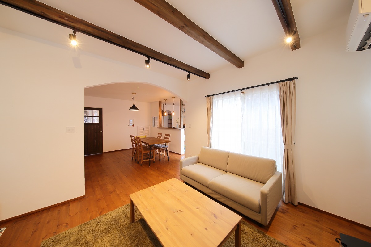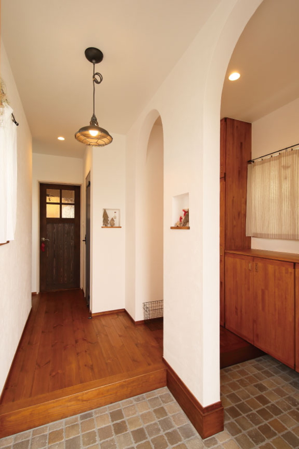 木空間に緩やかな変化をつけるリビングの垂れ壁。アールにしたことで広がりを演出しています。床はパインで、裸足でも気持ちが良く、シックな色合いでアンティークな雰囲気に仕上げました。玄関へとつながる扉は、こだわりのアンティークガラスを使ったオリジナルです。