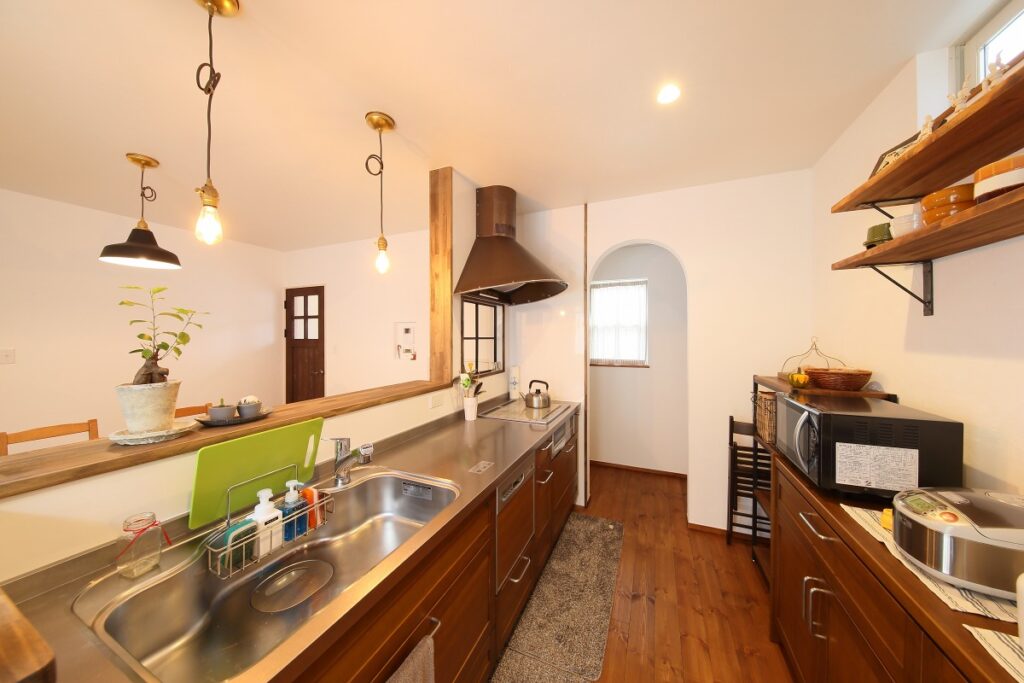 キッチンの棚はオリジナル制作。壁は漆喰で焼肉や鍋をした翌日にも匂いが残りません。奥にはパントリーを設けました。使い勝手と好きな雰囲気を持ち合わせた自慢のキッチンです。