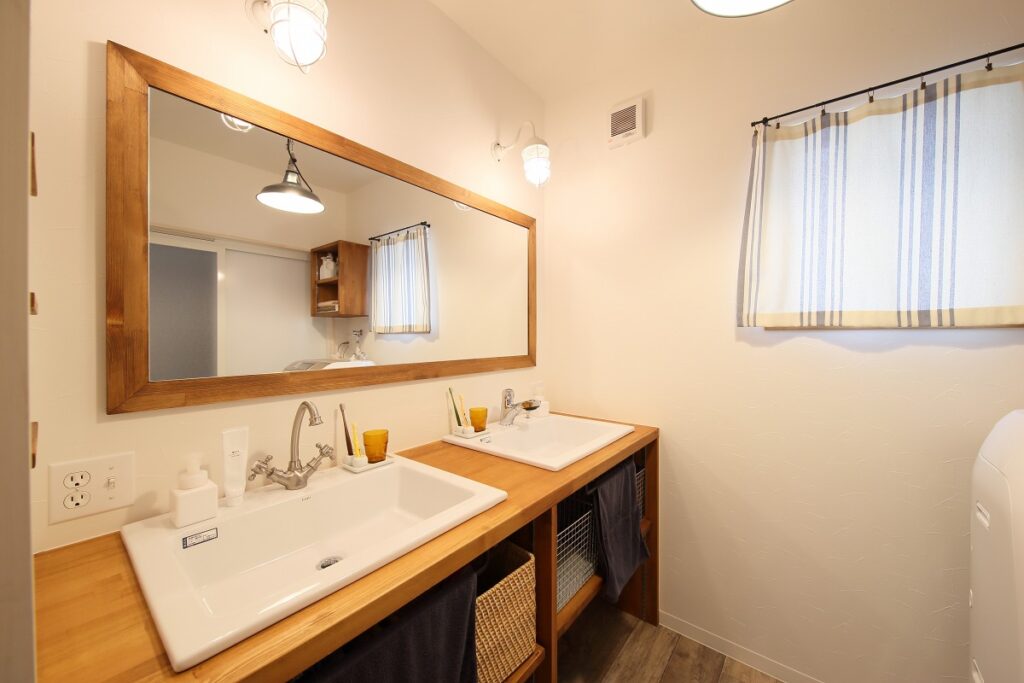 朝の支度がスムーズなようにと二つならんだ洗面。蛇口もひとつひとつこだわりました。