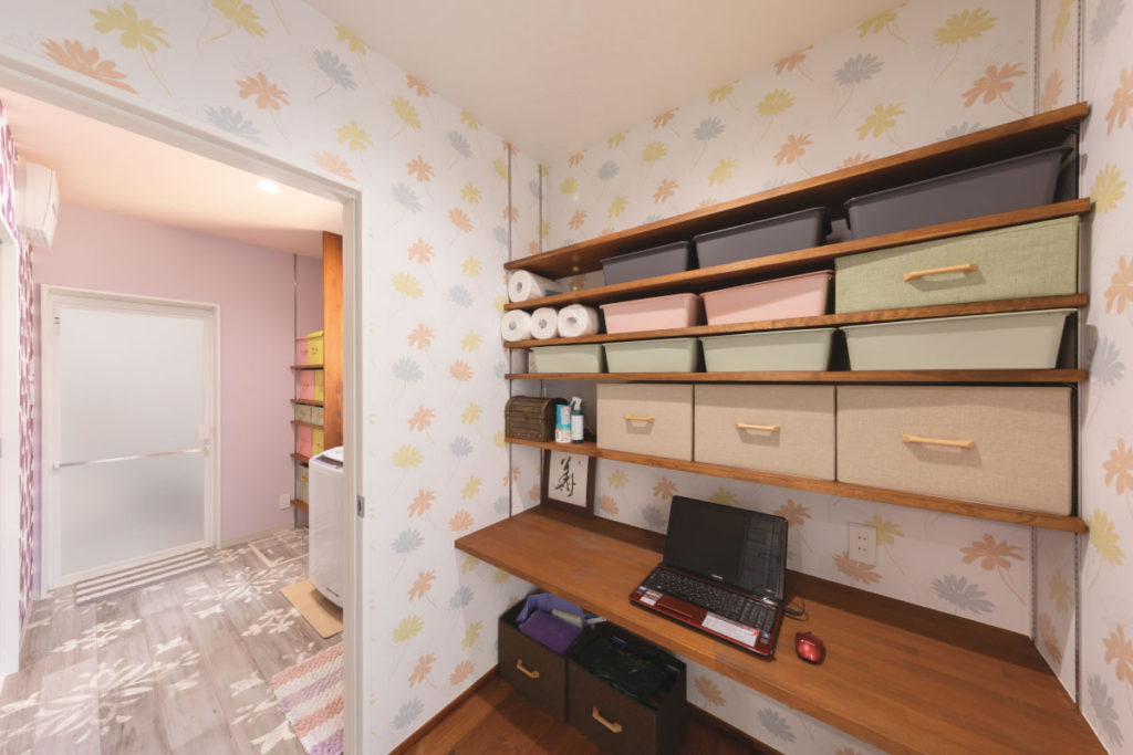 キッチン裏に配置されたパントリーには、ワークスペースもあり!収納+作業場として活躍中です。