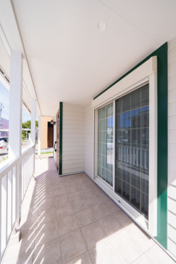まず外観はラップサイディング調の白壁に、屋根や窓枠をグリーンで統一してアクセントにしたカリフォルニアスタイル。